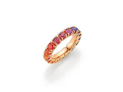 Ring aus 750/- Rotgold, poliert, mit 18 facettierten bunten Saphiren zusammen 3,55ct, 4,0 mm breit, drehbar