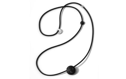 Kautschukhalsschmuck, mit großer und kleiner Kugel, 5 Brillanten 0,06ct W si in 750/- Weißgold gefasst, 750/- Weißgoldhülse und Element, Länge 100 cm