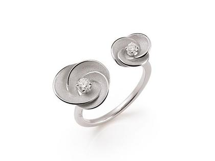 Ring aus 750/- Gold in der Farbe White Ice, poliert und mattiert, mit 2 Brillanten zusammen 0,160 ct TW vsi, offene Ringschiene