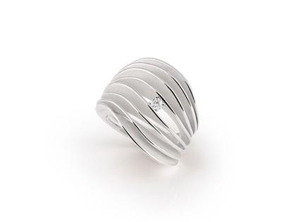 Ring aus 750/- Gold in der Farbe White Ice, poliert und satiniert, mit 1 Brillant 0,100 ct TW vsi, 8-reihig