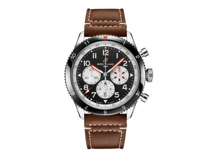 Als echte Pilotenuhr, die dafür konzipiert wurde, den Herausforderungen eines Vintage-Cockpits standzuhalten, verfügt die Super AVI Mosquito über grosse, hervorragend ablesbare arabische Ziffern auf dem Zifferblatt und der Lünette. Das robuste Gehäuse hat einen Durchmesser von 46 mm, die überdimensionierte Krone befindet sich an der 3-Uhr-Position. Die geriffelte Lünette sorgt für optimale Griffigkeit, während das Kalbslederarmband mit Ziernaht optisch an die klassischen Fliegerjacken erinnert. Piloten und andere Reisende werden die Möglichkeit schätzen, über die 24-Stunden-Markierung auf der Innenlünette und den GMT-Zeiger mit roter Spitze eine zweite Zeitzone anzuzeigen. Angetrieben wird die Super AVI von einem COSC-zertifizierten Breitling Manufakturkaliber B04, das eine Gangreserve von etwa 70 Stunden bietet.
