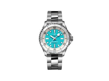 Automatik, Kaliber 17, Edelstahl, Durchmesser 36 mm, türkises (turquoise) Zifferblatt, Drehlünette mit weißer Keramikeinlage, Edelstahlband mit Faltschließe, entspiegeltes Saphirglas, 30 bar wasserdicht