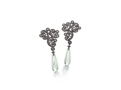 Ohrhänger aus 925/- Silber schwarz rhodiniert, symmetrisches Spitzenmuster mit 2 grünen Prasiolith-Pampeln, Gesamtlänge 39,0 mm