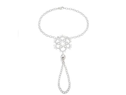 Der Handschmuck Fräulein Loreley ist Armband und Ring zugleich: Die kleine Schlaufe kommt über den Finger und die große wird am Arm befestigt, so dass das Ornament den Handrücken schmückt.
