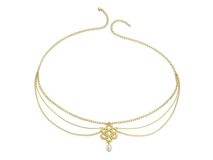 Kopfschmuck aus 925/- Silber vergoldet, mehrreihig mit Blumenornament und einer weißen Süßwasserperle, Ankerkette mit Karabinerverschluss, verstellbar