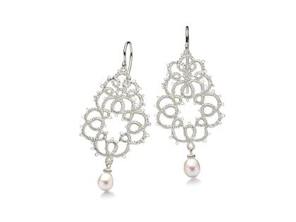 Ohrhänger aus 925/- Silber in symmetrischem Spitzenmuster mit 2 Süßwasserperlen, Gesamtlänge 6 cm