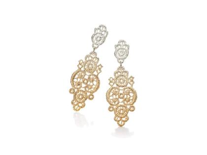 Ohrhänger aus 925/- Silber mit gelbgoldenem Farbverlauf, mit symmetrischem Spitzenmuster, 55 mm lang