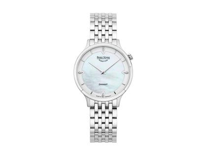 Quarz, Basiswerk Ronda 1062, Edelstahlgehäuse, Durchmesser von 35,0 mm, Höhe 5,3 mm, Perlmutt-Zifferblatt, besetzt mit insgesamt 4 Brillanten zusammen 0,020 ct TW si, feingliedriges Edelstahlarmband mit Faltschließe, Saphirglas innen entspiegelt, 3 bar wasserdicht