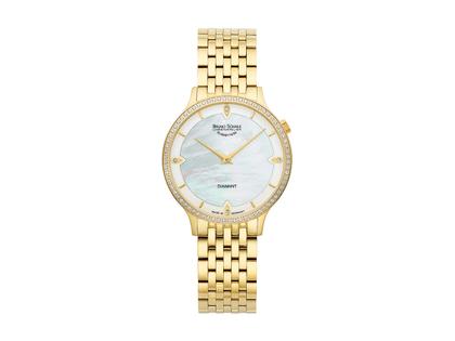 Quarz, Basiswerk Ronda 1062, Edelstahlgehäuse IP-Gelbgold beschichtet, Durchmesser von 35,0 mm, Höhe 5,3 mm, Perlmutt-Zifferblatt, besetzt mit insgesamt 76 Brillanten zusammen 0,380 ct TW si, feingliedriges Edelstahlarmband mit Faltschließe, Saphirglas innen entspiegelt, 3 bar wasserdicht
