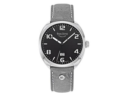 Herrenuhr, Quarz Basiswerk Ronda 6003.B, kissenförmiges Edelstahlgehäuse mit einem Durchmesser von 44,0 mm, schwarzes Zifferblatt mit Datum auf 6 Uhr, graues Kudulederband mit Dornschließe, Saphirglas innen entspiegelt, 5 bar wasserdicht