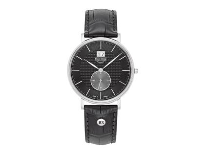 runde Herrenuhr, Quarz, Basiswerk Ronda 6004.B, Edelstahlgehäuse mit einem Durchmesser von 40,5 mm, Höhe 8,0 mm, schwarzes Zifferblatt mit Großdatum auf 12 Uhr, schwarzes Kalbslederband mit Faltschließe, Saphirglas innen entspiegelt, 5 bar wasserdicht