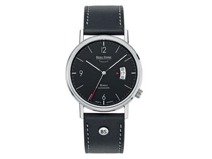 runde Herrenuhr, Automatikwerk BS175 (Basiswerk Sellita SW200), rundes Edelstahlgehäuse im Durchmesser von 41,0 mm, Höhe 9,5 mm, schwarzes Zifferblatt mit Datumsanzeige auf 3 Uhr, schwarzes Lederband mit Faltschließe, innen entspiegeltes Saphirglas, 5 bar wasserdicht