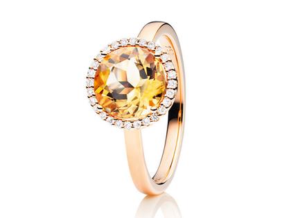 "Espressivo" Damenring aus poliertem 750/- Roségold mit einem runden Citrin Ø 9 mm und 28 Brillanten zusammen 0,10 ct TW si
