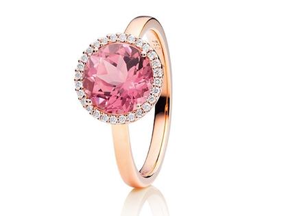 "Espressivo" Damenring aus poliertem 750/- Rotgold mit einem runden pinkfarbenem Turmalin und 28 Brillanten zusammen 0,10 ct TW si