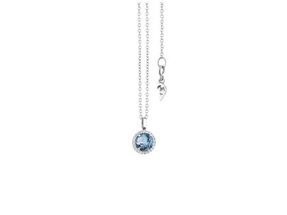 Halsschmuck aus 750/- Weißgold poliert, 1 dunklen Aquamarin ca. 0,84 ct, im Durchmesser von 6 mm, 22 Brillanten zusammen 0,060 ct TW si, Ankerkette, Länge 45 cm, Zwischenöse bei 42 cm, Karabinerverschluss