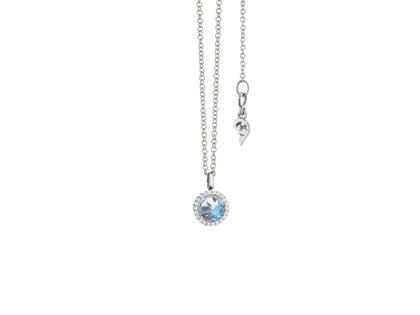 Halsschmuck aus 750/- Weißgold poliert, 1 Topas Sky Blue, ca. 0,92 ct, im Durchmesser von 6 mm, 22 Brillanten zusammen 0,060 ct TW si, Ankerkette, Länge 45 cm, Zwischenöse bei 42 cm, Karabinerverschluss