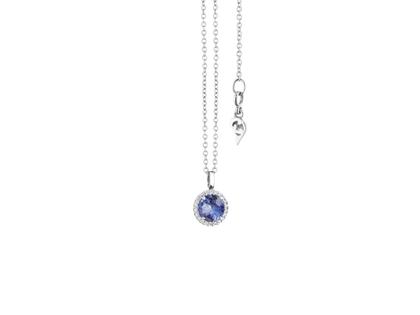 Halsschmuck aus 750/- Weißgold poliert, 1Tansanit ca. 0,92 ct, im Durchmesser von 6 mm, 22 Brillanten zusammen 0,060 ct TW si, Ankerkette, Länge 45 cm, Zwischenöse bei 42 cm, Karabinerverschluss