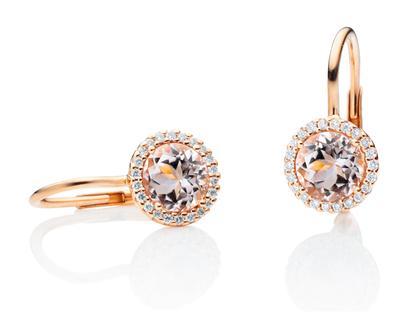 Espressivo Ohrhänger aus poliertem 750/- Roségold, je 1 Morganit rund und facettiert Ø 6 mm zusammen ca. 1,7 ct, 44 Brillanten 0,12 ct TW si1