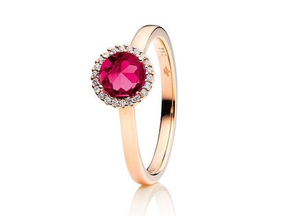 Ring aus poliertem 750/- Roségold, mit facettiertem Rhodolith Ø 6 mm ca. 1,02 ct, 22 Brillanten zusammen 0,06 ct TW si1