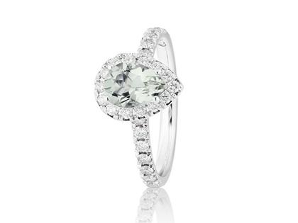 Ring aus 750/-Weißgold, 1 Prasiolith Pear cut 8x6 mm ca. 0.99ct, 40 Diamanten Brillant-Schliff 0.52ct TW/vs1, 1 Diamant Brillant-Schliff 0.005ct TW/vs1