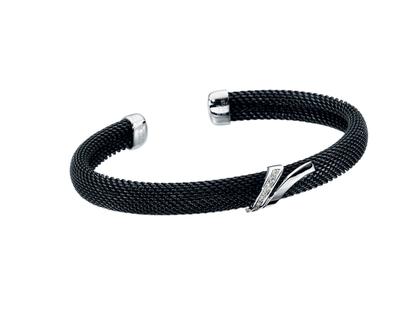 bombierter Armreif aus schwarz beschichtetem Edelstahl Milanaisegeflecht, 7 mm breit, mit 750/- Weißgold Schmuckelement und Endkappen und Brillanten 0,06ct. TW vsi