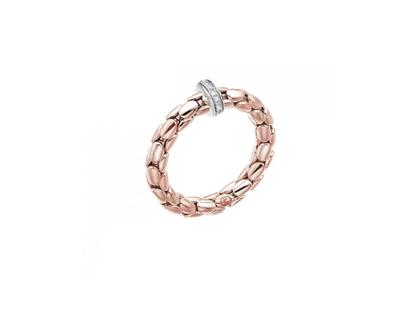 Ring aus 750/- Roségold poliert, mit flexiblen Feder-System, Brillant-Ronde aus Weißgold mit 17 Brillanten zusammen 0,100 ct TW (G) vsi, 3,0 mm breit