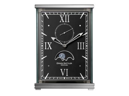 Tischuhr, Sattler Kaliber 2004 mit einer Gangdauer von 8 Tagen, Zugfeder mit Kraftausgleich durch Stellung, Schweizer Echappement mit Schraubenunruh, 12 Präzisionskugellager, 11 Rubine, Edelstahlgehäuse, zweiteiliges Zifferblatt schwarz eloxiert, handbemalte Mondphasenanzeige auf 6 Uhr, kleine Sekunde auf 12 Uhr, silberfarbene Stunden- und Minutenzeiger aus Stahl, ausgefräste römische Indizes, schwarze Minuterie, Passageschlag auf Glocke, U-förmiges Mineralglas