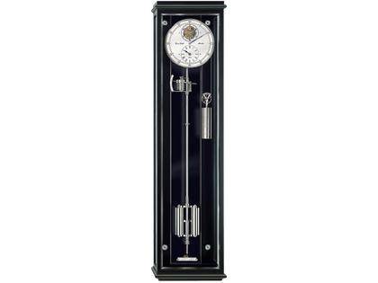 Regulator Präzisionspendeluhr mit Sattler Kaliber 1965 und einer Gangdauer von 30 Tagen mit 1-2 sec/Monat Ganggenauigkeit, edles Gehäuse aus schwarzem Schleiflack, Tür mit Magnetverschluss, Mineralglas facettiert, Zifferblatt versilbert, vergoldetes, feinverzahntes Räderwerk, Durchbruch im Zifferblatt, Glasdach