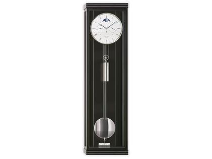 Seilzug-Regulator mit Sattler Kaliber 1565-4 und einer Gangdauer von 30 Tagen, edles Gehäuse aus schwarzem Schleiflack mit Metallintarsien, Tür mit Magnetverschluss, Mineralglas entspiegelt, Zifferblatt versilbert, handbemalte Mondscheibe, Anzeige von Datum und Wochentag,