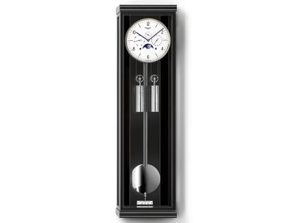 Seilzug-Regulator mit Sattler Kaliber 1575 und einer Gangdauer von 30 Tagen, edles Gehäuse aus schwarzem Schleiflack mit Metallintarsien, Tür mit Magnetverschluss, Mineralglas entspiegelt, Zifferblatt versilbert, handbemalte Mondscheibe, Anzeige von Datum und Wochentag,