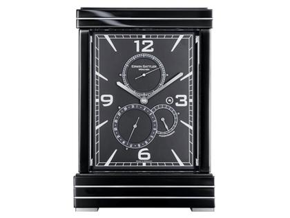 Tischuhr mit Sattler Kaliber 1385 mit einer Gangdauer von 15 Tagen, Gehäuse mit schwarzem Schleiflack und Metallintarsien (handpoliert), Zifferblatt schwarz eloxiert, kleine Sekunde, Datums- und Gangreserveanzeige, entspiegeltes Mineralglas, Aufzug auf Vorderseite - Schlüsselfach im Deckel der Uhr, hebt sich beim Öffnen der Tür