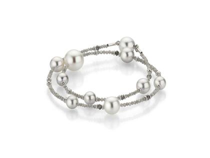 Dieses spektakuläre Armband besteht aus ca. 8 ct funkelnden grauen Diamanten! Im unverwechselbar lässigen Gellner Castaway Style sind Elemente aus 750/- Weißgold, sehr seltene graue Akoyaperlen und kostbare Südseeperlen edel kombiniert. Der Armschmuck wird zweireihig getragen. Dank des raffiniert in den Perlen versteckten Magnetverschlusses lässt es sich spielend leicht anlegen und schmiegt sich scheinbar endlos ans Handgelenk.