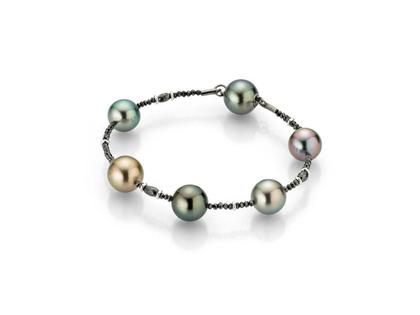 Armband 750/- Weißgold schwarz rhodiniert, Diamant  Rice ca. 0,900 - 1,100 ct schwarz behandelt, Diamant Bead ca. 2,520 - 3,080 ct schwarz behandelt, 6 Maruteaperlen, Magnetverschluss, 16 cm lang