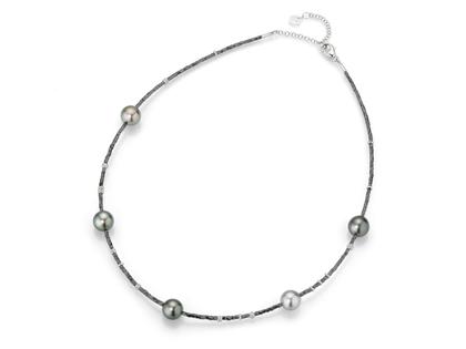 Halsschmuck aus 750/- Weißgold, schwarze Diamond Pipes ca. 10,683 - 13,057ct, 4 Tahiti-Zuchtperlen multi semi rund 9 - 12 mm, Karabinerverschluss, 40-45cm cm lang