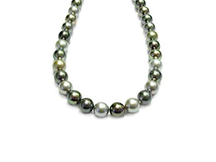 Perlenkette aus 45 Tahiti-Zuchtperlen in schönen Blau- und Grüntönen, Perlengröße 9,0 – 10,0 mm, Lüster AA , Spotlevel: 2-3 - ohne Verschluss