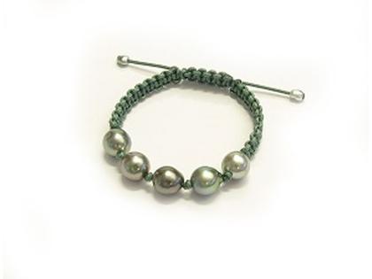 Armband aus 5 Maruteaperlen multi intense baroque 11-12 mm, 2 Tahiti-Zuchtperlen multi Keshi, Band maruteagrün, 16 cm