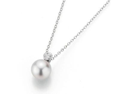 750/- Weißgold, 1 Südsee-Zuchtperle rund 9 - 10 mm, 1 Brillant 0,120 ct TW vsi, Karabinerverschluss, Länge 42 - 45 cm