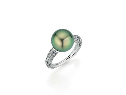 Ring aus 950/- Platin poliert, 138 Diamanten zusammen ca. 1,378 ct grau, 1 Marutea-Zuchtperle grün intense rund 12,0 - 13,0 mm, Spannring-Ausführung
