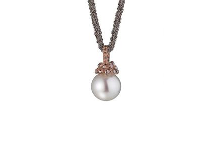 Collier 925/- Silber braun rhodiniert, 750/- Rosegold, Südsee-Zuchtperle weiß 14 bis 15mm, 10 Brillanten braun si ca. 0,170 ct, 18 Diamanten Briolette ca. 2,673 ct bis 3,267 ct braun, Karabinerverschluss, 100 cm lang