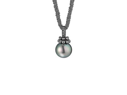 Collier 925/- Silber schwarz rhodiniert, 750/- Weißgold schwarz rhodiniert, Tahiti-Zuchtperle 14 bis 15mm, 10 Brillanten TW schwarz ca. 0,170 ct, Diamant Briolette ca. 4,050ct bis 4,950ct schwarz beh., Karabinerverschluss, 100 cm lang