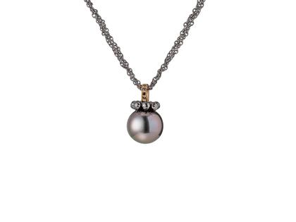 Das bezaubernde Collier besteht aus einem Anhänger in 750/- Rosegold, mit 4 schwarzen Brillanten ca. 0,024 ct, mit einer cherryfarbenen Tahitiperle im Durchmesser 10 – 11 mm, gekrönt von einem Kranz aus schwarzen Diamant-Briolettes ca. 0,909 ct - 1,111 ct und einer 42 cm langen schwarz rhodinierten Silberkette in einer außergewöhnlich attraktiven Kettenstruktur. Den Verschluss der Kette bildet ein formschön gestalteter Karabiner.