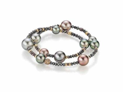 2-reihiges Armband aus 750/- Roségold und schwarzen und braunen Rohdiamanten ca. 21,4 ct mit 11 Tahiti-Zuchtperlen, 34 Brillanten ca, 0,465 ct braun si, Magnetverschluss, 19 cm lang