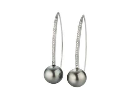elegante Ohrhänger in 750/- Weißgold poliert, 42 Brillanten 0,336 ct TW vsi, 2 Tahiti-Zuchtperlen mittel/medium 11-12 mm
