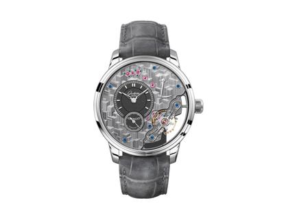 Handaufzug Kaliber 66, Gehäuse 950/- Platin, Durchmesser 42 mm, Höhe 12 mm, freier Blick auf das Uhrwerk samt Duplex-Schwanenhals-Feinregulierung und Schraubenunruh, verschraubte Goldchatons, mit Streifenschliff polierte Platine, rhodiniert, dezentrale Zeitanzeige, Gangreserveanzeige, polierte Weißgoldzeiger, graues Nubuk-Alligator-Lederband, Platin-Faltschließe, beidseitig Saphirglas, 5 bar wasserdicht, 41h Gangdauer, nur 50 Exemplare weltweit