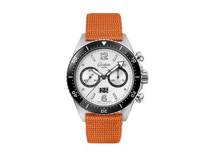 Glashütte Original SeaQ Chronograph Silver Screen Automatik Edelstahl 43mm silberfarbenes Zifferblatt orangefarbenes Textilband