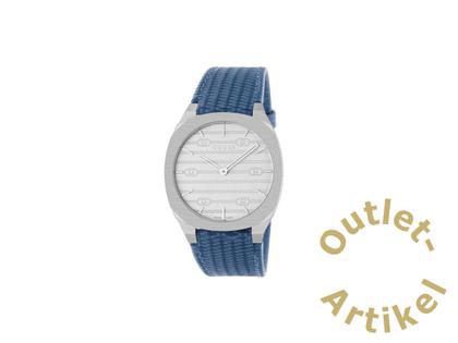 Gucci 25H Quarz Edelstahl 34mm silbernes Zifferblatt blaues Lederband YA163422