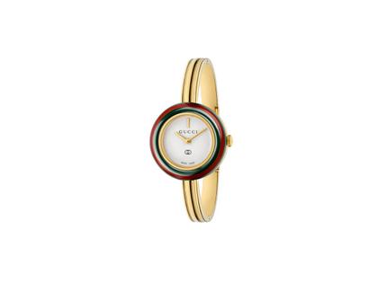 Schweizer Quarzwerk, poliertes Edelstahlgehäuse Gelbgold-PVD beschichtet im Durchmesser von 28,0 mm, Edelstahl-Krone Gelbgold-PVD beschichtet, 7 verschiedenfarbige austauschbare Keramik-Lünettenringe, weißes Zifferblatt, Gucci-Logo auf 6 Uhr, gelbgoldfarbene Zeiger, gelbgoldfarbener Index auf 12 Uhr, polierte Edelstahl-Armspange Gelbgold-PVD beschichtet, Saphirglas entspiegelt, Edelstahl-Gehäuseboden, 5 bar wasserdicht