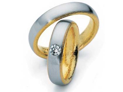 Eheringe aus 950/- Platin und 999/- Feingold, Oberfläche getrommelt, gewölbt, innen poliert, 5,0 mm breit, bestehend aus: