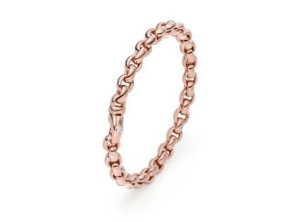 handgefertigtes massives Glieder-Armband aus 750/- Rotgold, poliert, 8 mm breit, integrierter Karabinerverschluss, 1 Brillant 0,06ct TW(G) vvsi, 19 cm lang