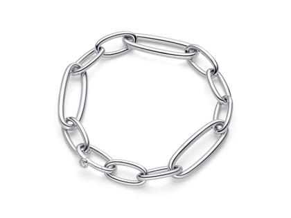 handgefertigtes Glieder-Armband aus 750/- Weißgold, poliert, 11 mm breit, integrierter Verschluss, 1 Brillant 0,09 ct TW(G) vvsi, 20 cm lang